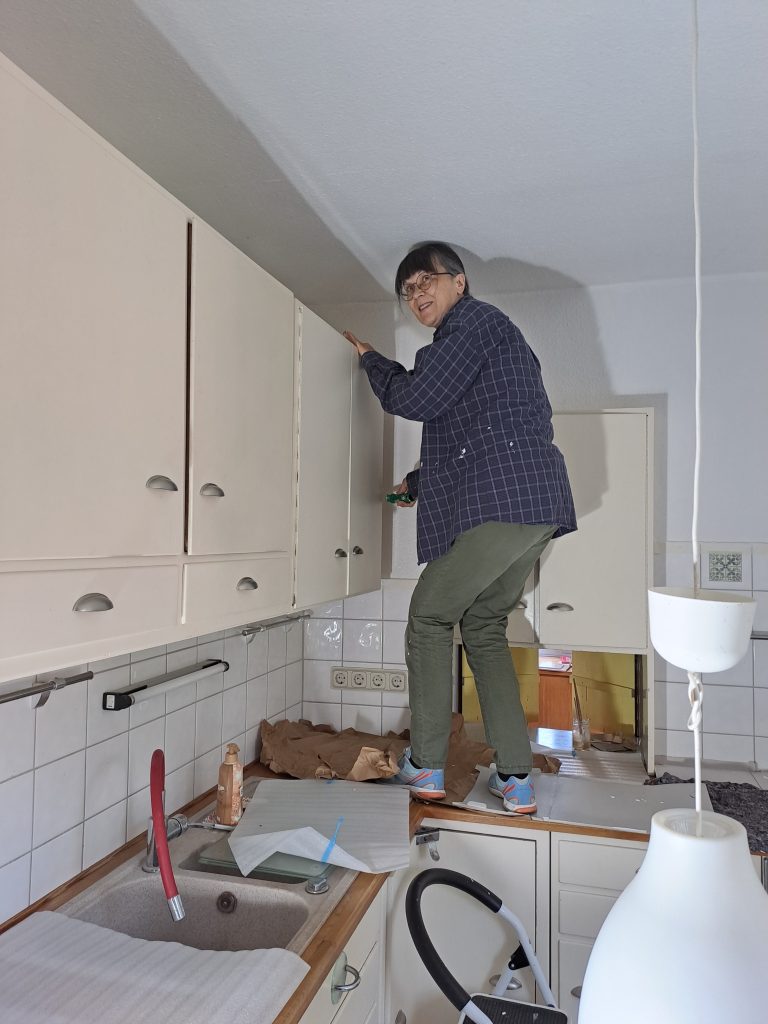 Die Küchenwände haben wir uns nach dem Abschleifen des Bodens vorgenommen, da wir den Schleifstaub zuerst beseitigen wollten. Astrid, die sehr gern malert, hat sich dann den verbliebenen Ecken und Winkeln gewidmet.