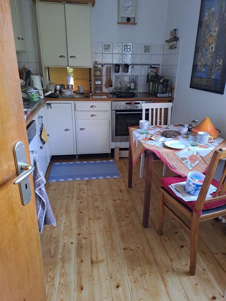 Die Küchenmöbel sind immer noch original aus den 60iger Jahren, denn weil sie aus Tischlerplatten gebaut sind, haben sie eine hervorragende Qualität. Wir haben sie 1999 lediglich anders angeordnet, mit Elektrogeräten ergänzt, mit einer Leimholzplatte versehen und mein Vater hat die Fronten für uns dann weiß lackiert. Diese Möbel zu verrücken, wäre ein großer Aufwand gewesen, den wir gescheut haben.